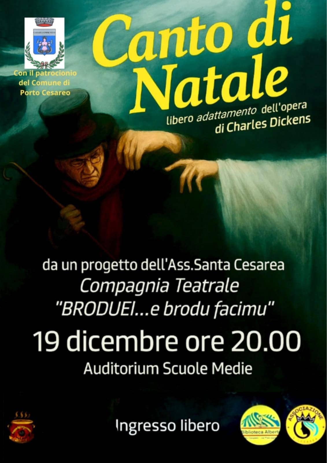 PORTO CESAREO (LE) – Teatro, emozione, comunità. Venerdì 19 dicembre dalle 20:00, presso l’auditorium della Scuola Media di Porto Cesareo, andrà in scena la prima teatrale della compagnia di “Broduèi e brodu facimu”. Un nome ironico e anche un po’ identitario che racconta bene lo spirito dell’iniziativa, nata da un’idea dell’Associazione Santa Cesarea coadiuvata dalla Biblioteca Alberti. Lo spettacolo patrocinato dal Comune di Porto Cesareo, si intitola “Canto di Natale”, ispirato al celebre testo di Charles Dickens, affidato alla direzione artistica del professore Mario Seclì. Da anni è punto di riferimento del teatro nel territorio, figlio d’arte e direttore artistico di lungo corso, con alle spalle esperienze e collaborazioni in diverse compagnie teatrali.